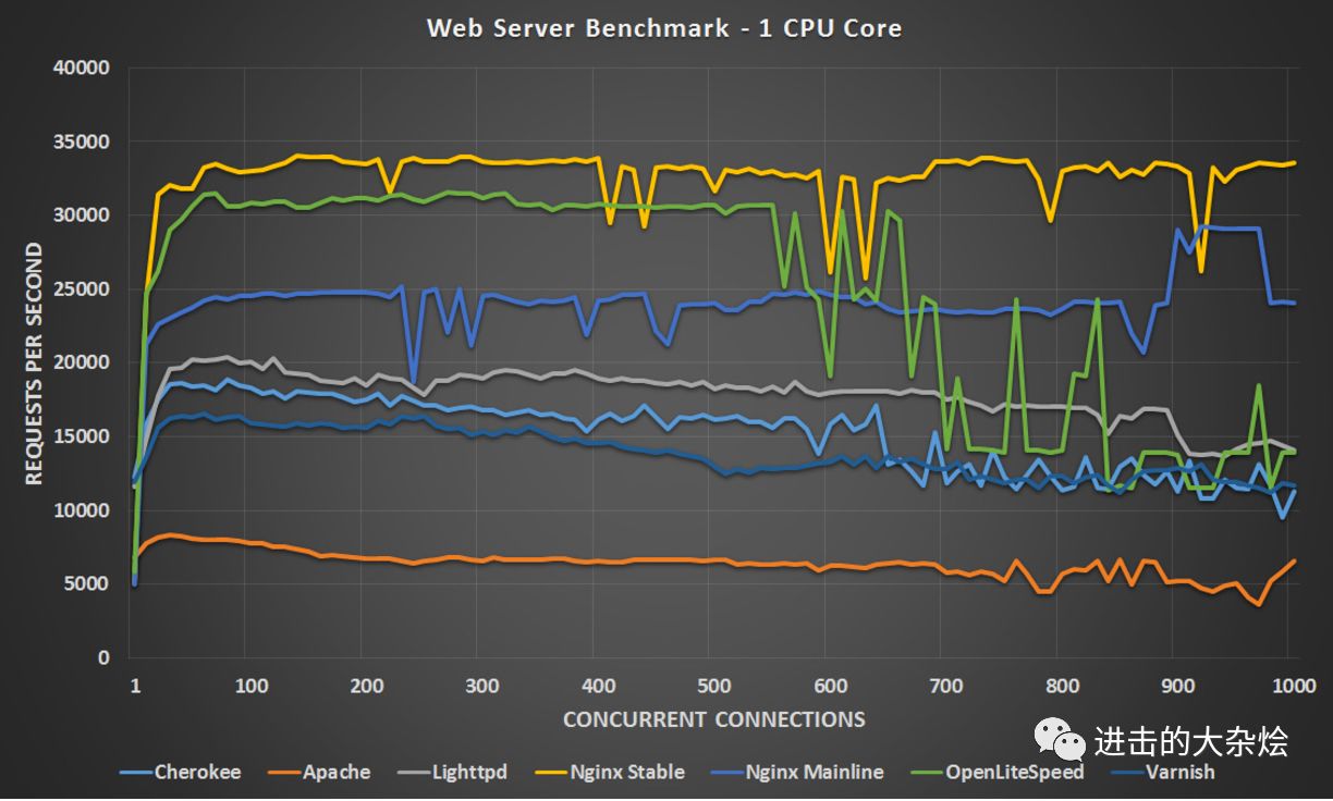 只有相关事件发生时,才处理具体数据 如果当前接口没有数据时,就会立即切换出去,处理其它请求,所以,虽然只有一个线程,但是,可以同时处理很多很多的請求处理 那么,这种形式的 web 系統,可以很轻易的将 cpu 跑满,即使带宽没有跑满的情况下; 而 apache 这类多进程多线程模型的服务器,则很难将 cpu 跑满。