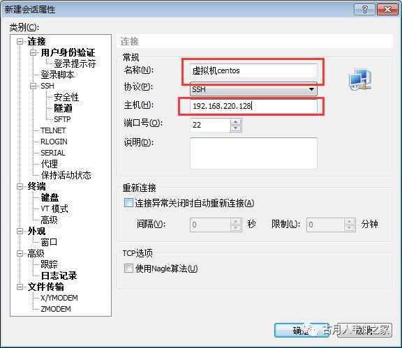 名称:自己输入,Snail的名称为“虚拟机centos”,主机为:centos的IP地址(注意:查看centos的IP地址,使用命令ifconfig);填写好之后,点击确定