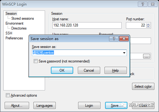 Host Name:为centos的ip地址;User name:为centos的登录用户名;Password:为之前设置的centos的登录密码,填好之后,选择save,保存,以方便下次使用