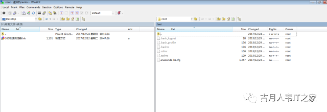 如果出现上图所示,则证明WinSCP已经连接上了centos,可以使用该工具实现文件传输。左边为Window窗口,右边为Linux窗口