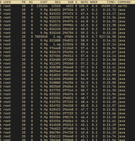 运行 TPC-DS 自带的 sql8,使用 top 观察其中的一个节点的工作负载,发现启动了大量的 JVM 进程。