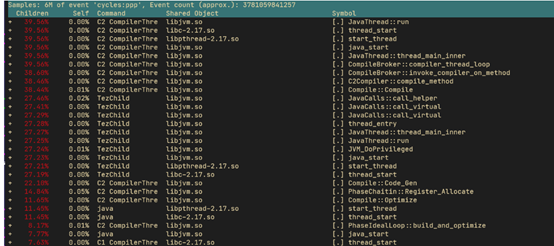 同时使用 perf 采集整机的热点数据,发现 JVM 的 C1, C2 编译线程占比很高,如下图所示。因此判断 hive sql 的 startup 和 warmup 阶段占比比较高,可以考虑从这两个方向优化。