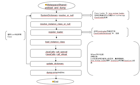 第三步:JVM 在启动的过程中会把 jsa mmap 到内存中,然后在触发类加载时候 JVM 会首先尝试从这块 mmap 进来的内存中去获取 klass 对象,如果获取到则会更新 JVM 内部的 SystemDictionary,以后再来获取对应的 klass 对象则不需要从 jsa 中获取。如果获取失败,JVM 则会走正常的类加载流程,尝试从 classpath 中加载对应的 class 文件,解析,链接,初始化,然后再放入 SystemDictionary 中。