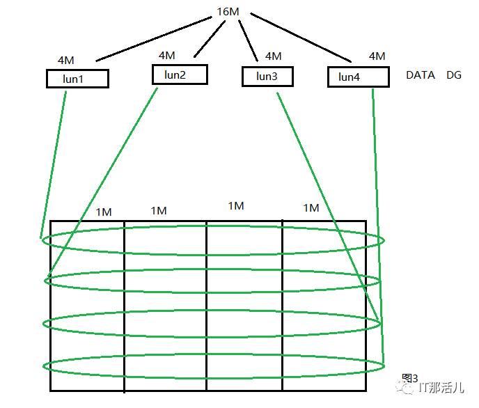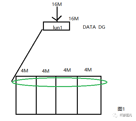 假如有数据来了,要往DATA中写16M数据,因DATA DG中就有一块盘,就是Lun1,那么这16M数据都会写到lun1中,而Lun1在存储中又是从4块盘上划的,所以数据会均匀地写到这4块盘中,每块盘写4M,16M数据一次写完。