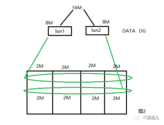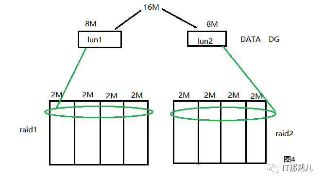 假如有数据来了,要往DATA中写16M数据,因DATA DG中现在有两块盘,而这两块盘还是来自同一个raid组,那么这16M数据会均匀写到这两个lun中,每个lun中写8M数据。