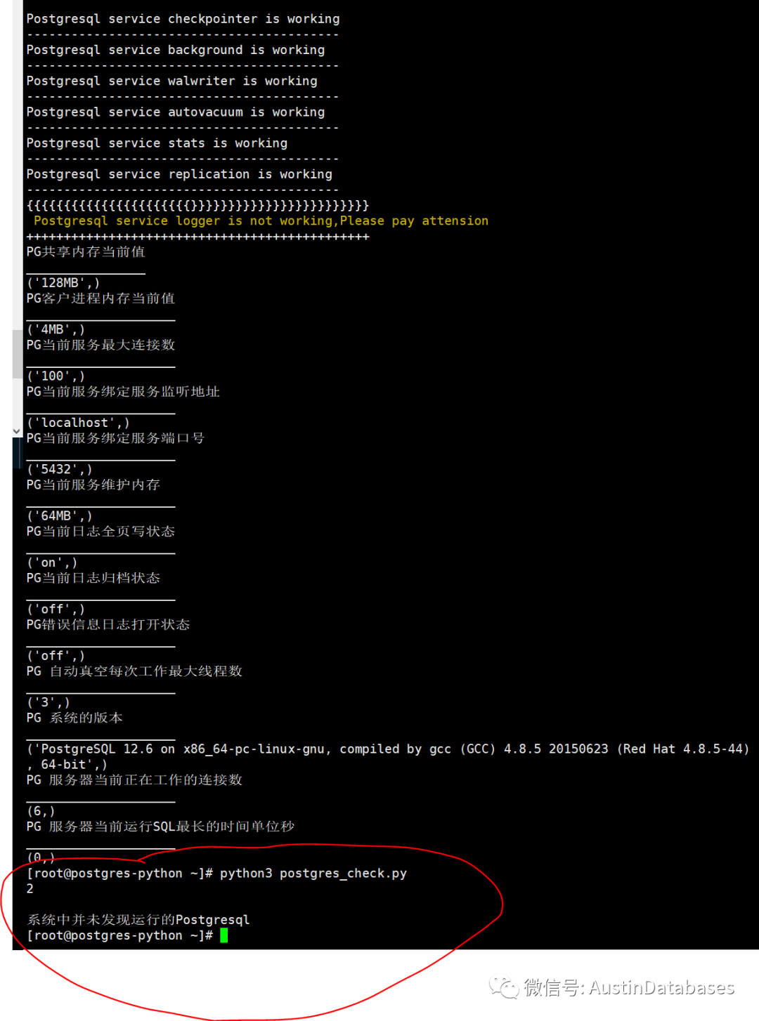 2 判断当前PG服务器上运行的子进程是否齐全,如果不齐全会打印缺少的子进程服务