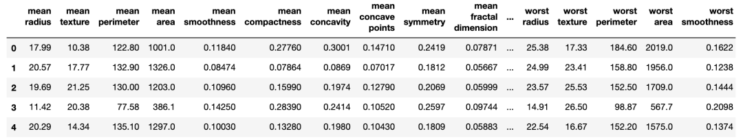 df_X = pd.DataFrame(cancer['data'], columns=cancer['feature_names'])