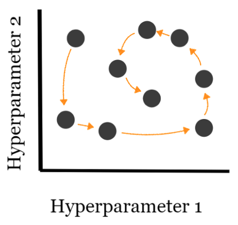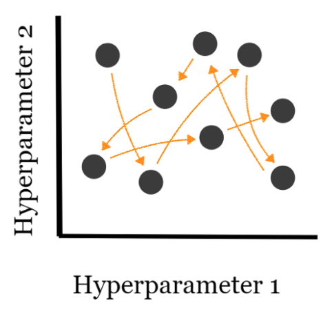 网格搜索尝试超参数的所有组合,因此增加了计算的时间复杂度,在数据量较大,或者模型较为复杂等等情况下,可能导致不可行的计算成本,这样网格搜索调参方法就不适用了。然而,随机搜索提供更便利的替代方案,该方法只测试你选择的超参数组成的元组,并且超参数值的选择是完全随机的,如下图所示。