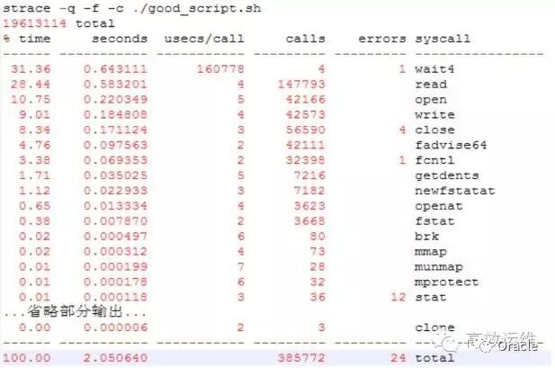 而poor_script.sh完成同样的任务则花了539秒。它大部分的调用开销都在进程和内存管理上(wait4/mmap/getpid…)。