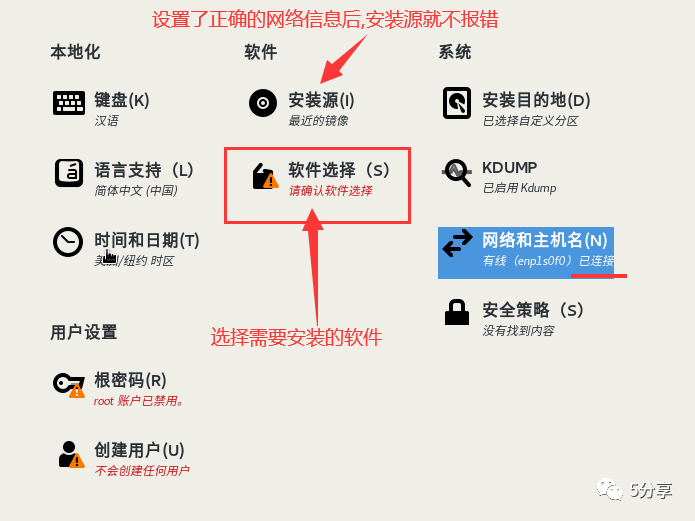 在软件选择选项中选择安装的模式。例如“包含图形界面Server with GUI”选项会在安装后的系统中提供图形界面,而如果想安装尽可能少的额外软件,可以选择“最小化安装Minimal Install”。