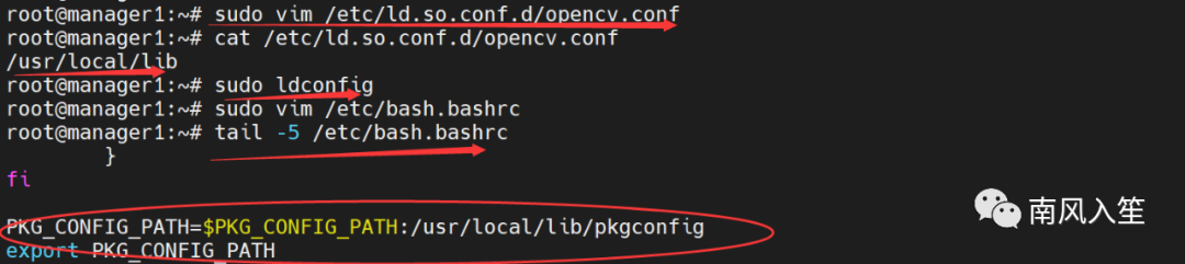 创建并编辑该文件:vi etc/ld.so.conf.d/opencv.conf , 写入/usr/local/lib;接着执行ldconfig命令,使得运行时能够让系统找到该路径;然后执行命令:vim etc/bash.bashrc 命令,编辑该文件,输入:PKG_CONFIG_PATH=$PKG_CONFIG_PATH:/usr/local/lib/pkgconfigexport PKG_CONFIG_PATH查看版本号命令:pkg-config --modversion opencv