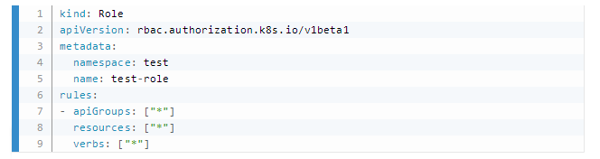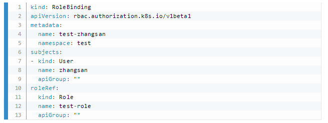 接下来为 zhangsan 授权,首先生成一份角色:test-role, 权限为test 的命名空间下的所有资源的所有操作权限