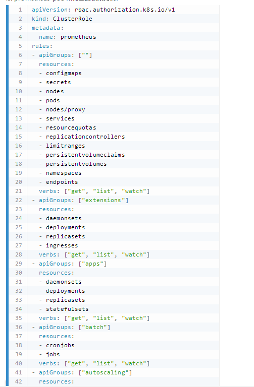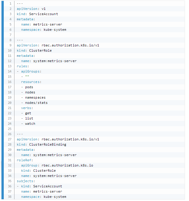 以 metrics-server的 pod 为例,需要对 pod、node、ns 等资源进行 get list操作,因此权限配置为: