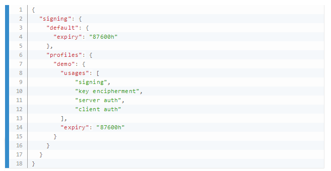 创建用来生成 CA 文件的 JSON 配置文件,这个文件后面会被各种组件使用,包括了证书过期时间的配置,expiry字段