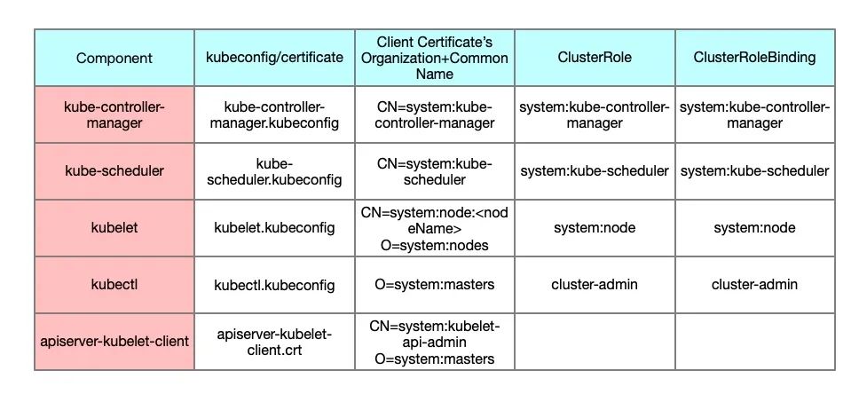 客户端证书认证叫作 TLS 双向认证,也就是服务器、客户端互相验证证书的正确性,在都正确的情况下协调通信加密方案。apiserver 、controller-manager、scheduler、kubelet 等组件之间的交互,一般也是基于X509的客户端认证方式,目前最常用的 X509 证书制作工具有 openssl、cfssl ,上面生成 kubeconfig 时用到就是 cfssl 工具签发的证书。