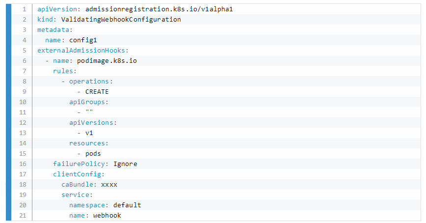 admission webhooks是同步调用,需要部署webhook server,并创建对象ValidatingWebhookConfiguration 或 MutatingWebhookConfiguration来指向自己的 server,以ValidatingAdmissionWebhook为例: