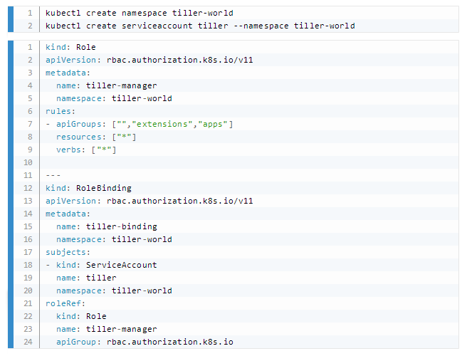 tiller pod 运行在kube-system 下,拥有集群所有ns、所有资源的操作权限,不过你也可以限定tiller的使用范围,比如只能在特定的 namespace 下工作,如: