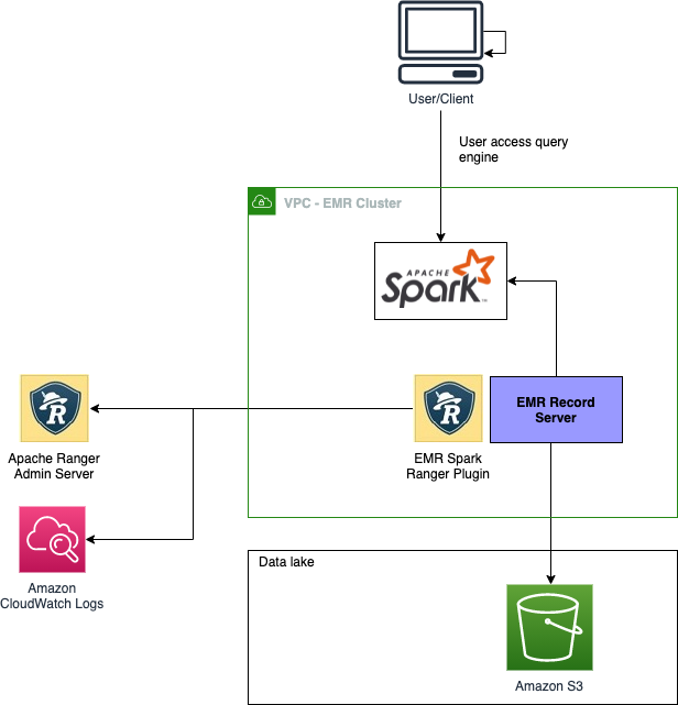Amazon EMR 使用 Amazon EMR 记录服务器实现了对 Apache SparkSQL 的支持,该服务器会读取 Apache Ranger 策略定义、评估访问权限并筛选数据,然后再将数据传回各个 Spark 执行程序。