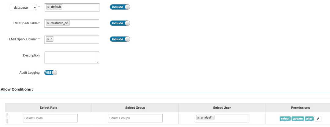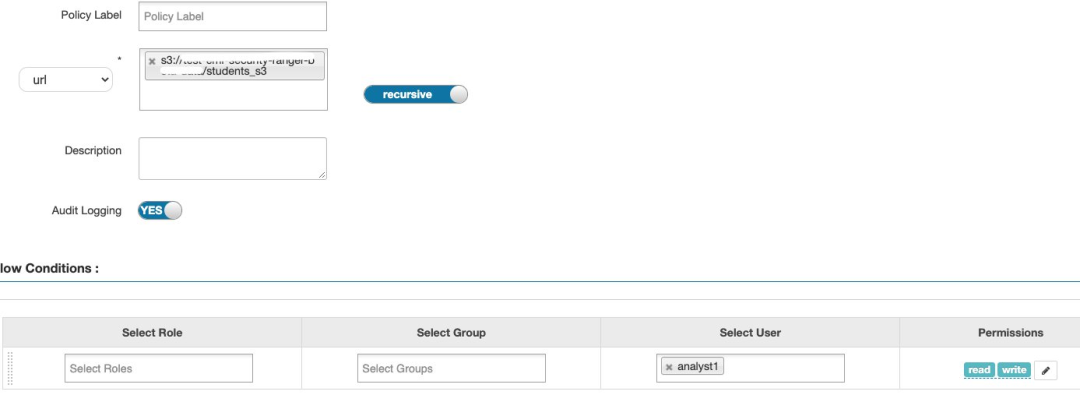 现在,您可以在 Apache Ranger 上设置授权策略。以下屏幕截图说明了此过程。