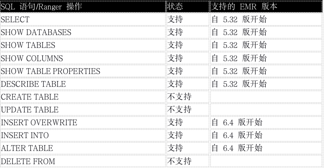 Amazon EMR 6.4 为 Apache Ranger 2.0 的数据操作语句引入了额外的授权功能。您可以在 SparkSQL 中使用 INSERT INTO、INSERT OVERWRITE 和 ALTER 等语句,并使用 Apache Ranger 策略控制授权。