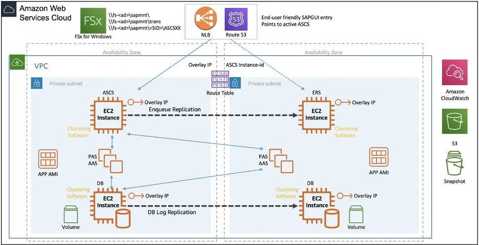 在SAP云上官方架构设计指引中,展示了如何利用其多可用区的技术优势、诸如Route 53、NLB等基础设施服务以及SAP或操作系统的高可用技术实现端到端的跨可用区高可用方案。