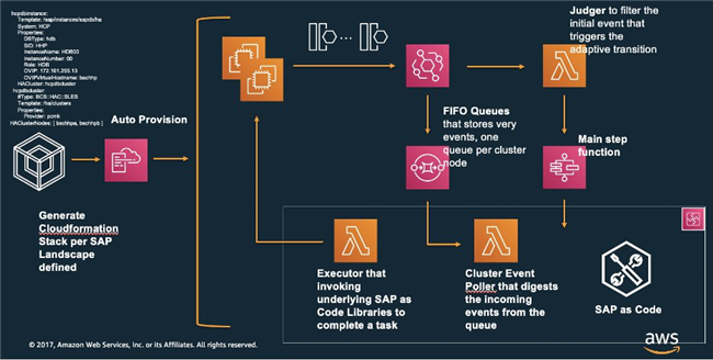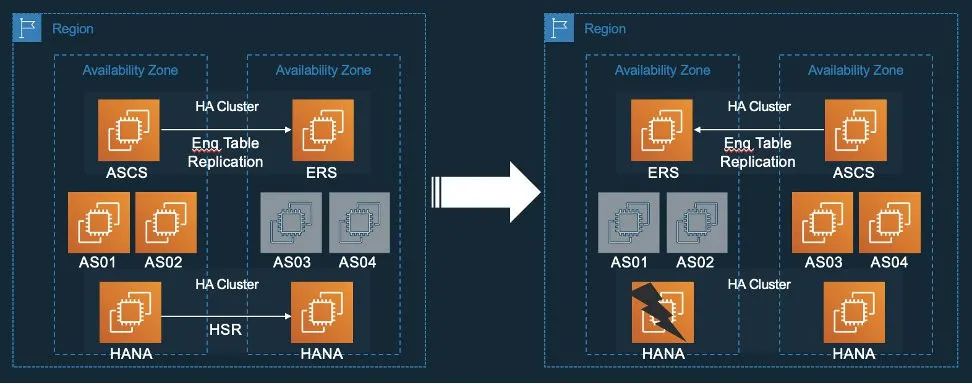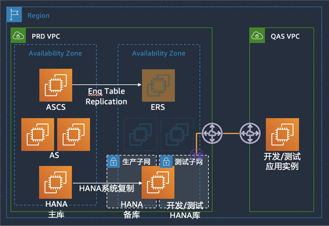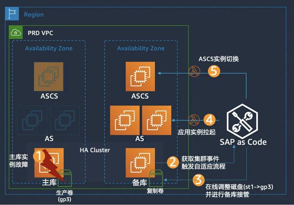 在此架构方案中,SAP应用实例AS01/02始终与HANA主实例所在可用区保持一致,在另一个可用区,预先准备好SAP应用实例AS03/04供自适应流程进行管理,二在自适应流程过程的最后,AS01/02将被正常关闭。