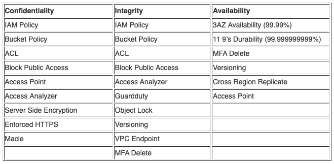 以下表格尝试将与S3访问控制相关的亚马逊云科技功能映射到CIA安全模型:
