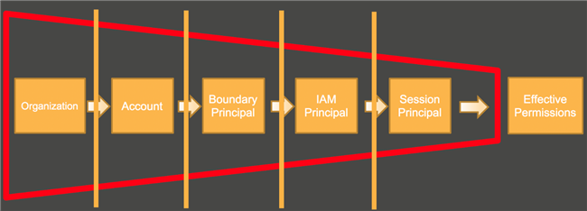 一个IAM主体最终拥有的IAM permission,会经过图中不同权限管理功能的层层规范。举例来说,决定一个IAM user的最终权限,可以从该user的IAM policy所定义的权限出发,去掉Organizations SCP未赋予该user所在的亚马逊云科技账号的那部分权限,去掉不在Permissions Boundary赋予该user的权限范围的权限,最终得到的即是该user真正拥有的IAM权限。在此图中,‘Session Principal’指的是由该user调用STS API(如assumerole)获取到另一个IAM role的临时权限,则assumed role(被调用的角色)的权限也会纳入最终考量。在此不做展开。