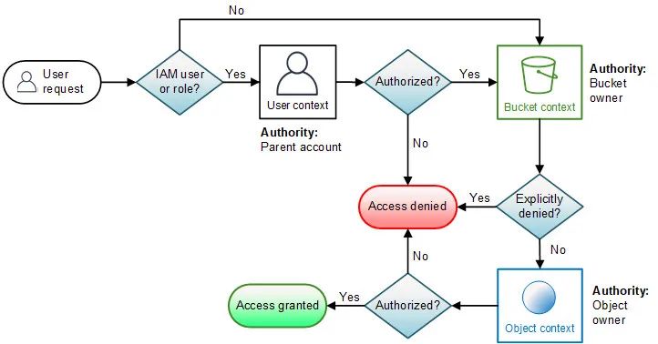 在本图中,User context对应的是发起请求的IAM user所在的亚马逊云科技账号层面;Bucket context对应的是所请求的存储桶层面;Object context对应的是所请求的文件层面。对于某个文件的访问请求,将在这三个层面来考察该请求是否被允许。