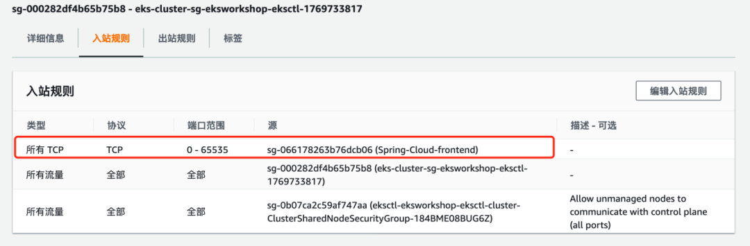 通过eksctl创建的EKS群集,worker node上的安全组默认没有开放VPC内其他EC2的访问权限。手工调整对应的安全组,添加一条允许其他Spring Cloud基础设施的安全组访问的条目。