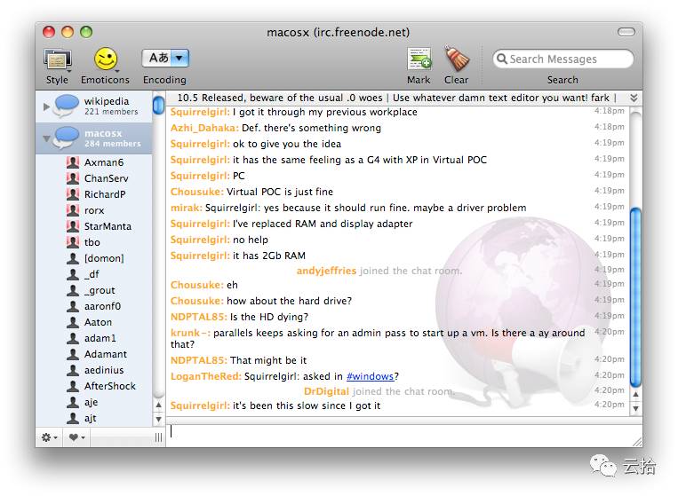 IRC客户端介绍及比较:https://en.wikipedia.org/wiki/Comparison_of_Internet_Relay_Chat_clients#Operating_system_support