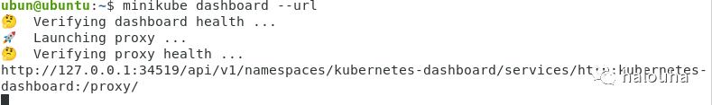 然后我们要启动k8s控制面板-dashbord服务,下面的命令里 --url 的意思是启动后,打印dashbord的url。不带的话会启动你本机浏览器打开。