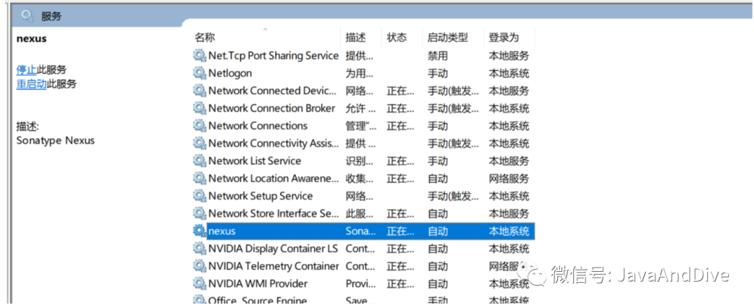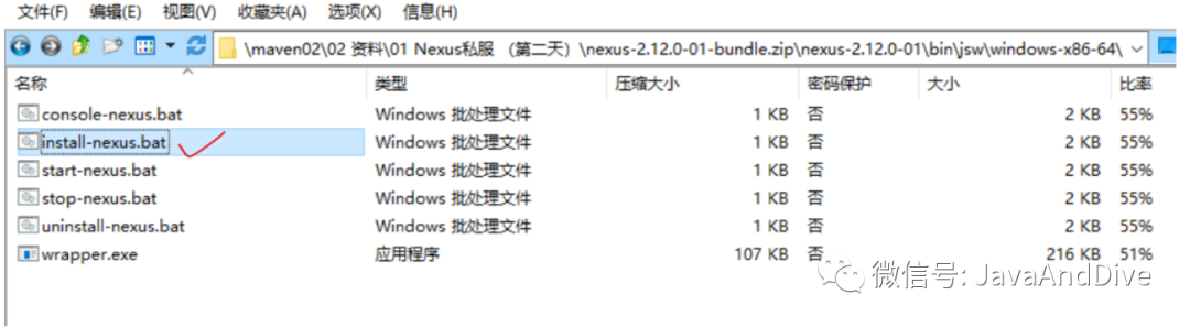 在路径“nexus-2.12.0-01\bin\jsw\windows-x86-64\”目录下:双击console-nexus.bat为后台启动Nexus;双击“install-nexus.bat”则会注册为一个windows服务。