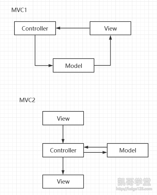 在介绍SpringMVC之前我们先来简单提一下MVC模式,MVC是很经典的一个架构模式,早在桌面时代就已经存在了,使用MVC模式我们能够开发出来一个松耦合的应用,让应用分为模型 - 控制器 - 视图。想必各位都对MVC很熟悉了,也都知道MVC有两种模式,分别为MVC1和MVC2,如下:
