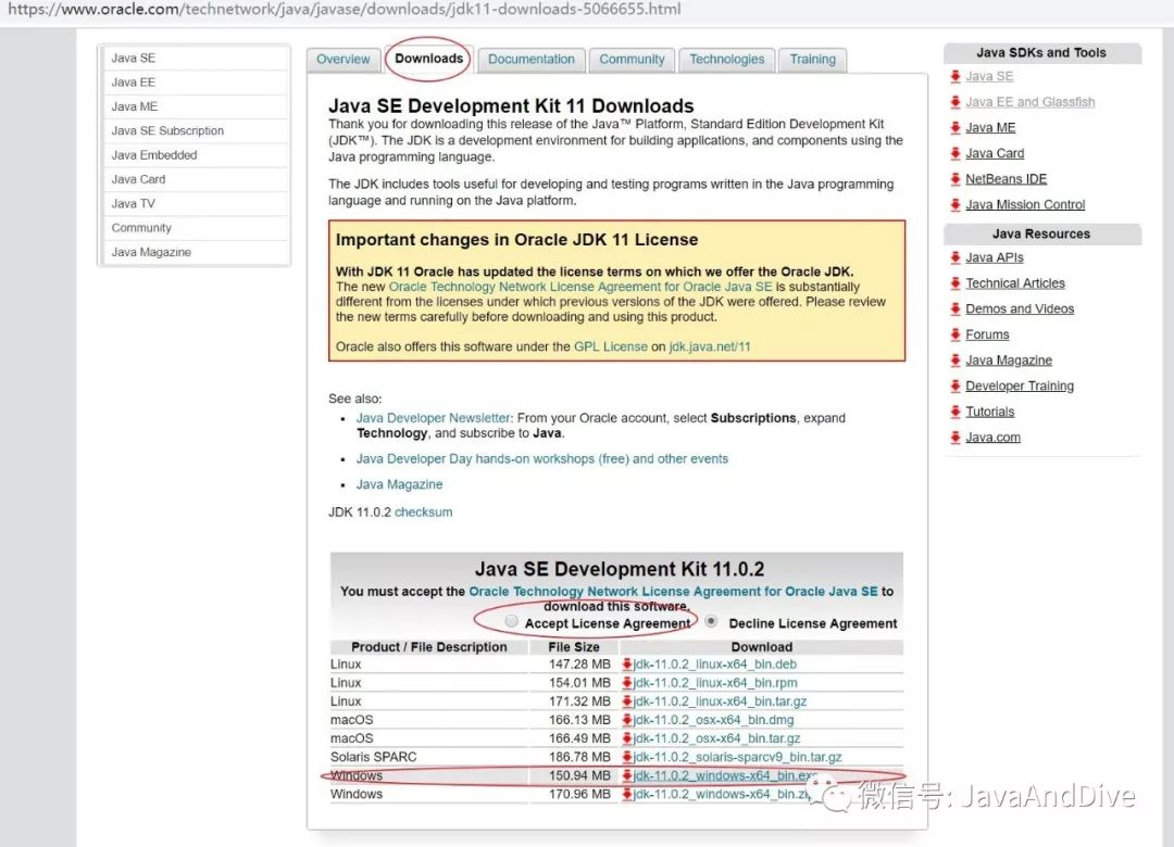 https://www.oracle.com/technetwork/java/javase/downloads/jdk11-downloads-5066655.html ,点开链接看到如下图所示的界面: