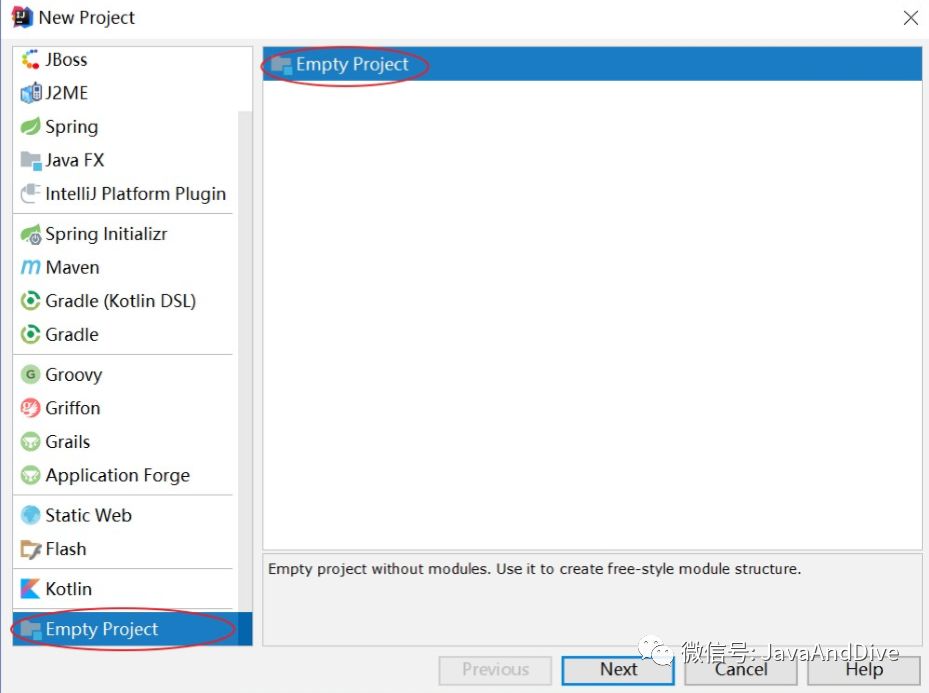 2. 在弹出的 New Project 对话框中选择 Empty Project ,我们创建一个空的工程