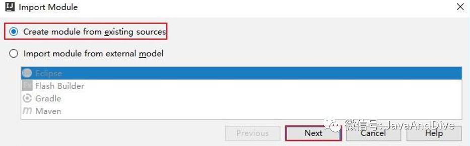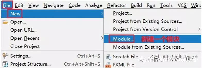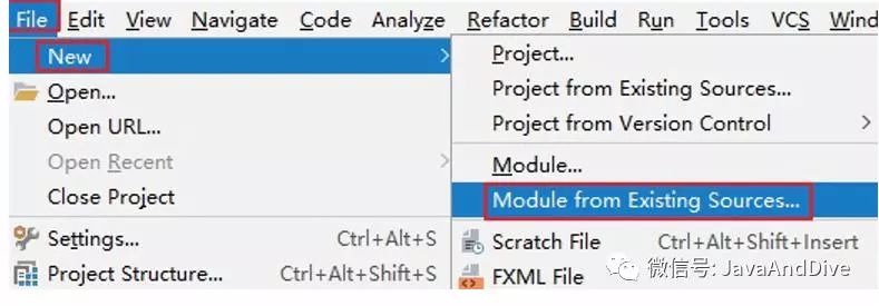 2. 开始导入模块,选择 File -> New -> Module from Existing Sources...