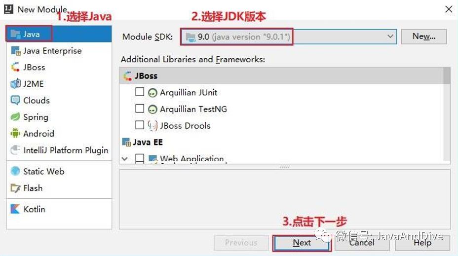 8. 选择新建Java模块,这里以JDK9.0为例(需要手动选择集成之前安装好的JDK)