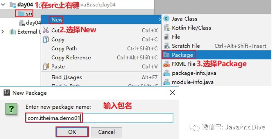 1. 展开创建的工程,在源代码目录 src 上,鼠标右键,选择 new->package ,(这里以黑马为例)键入包名 com.itheima.demo ,点击确定。