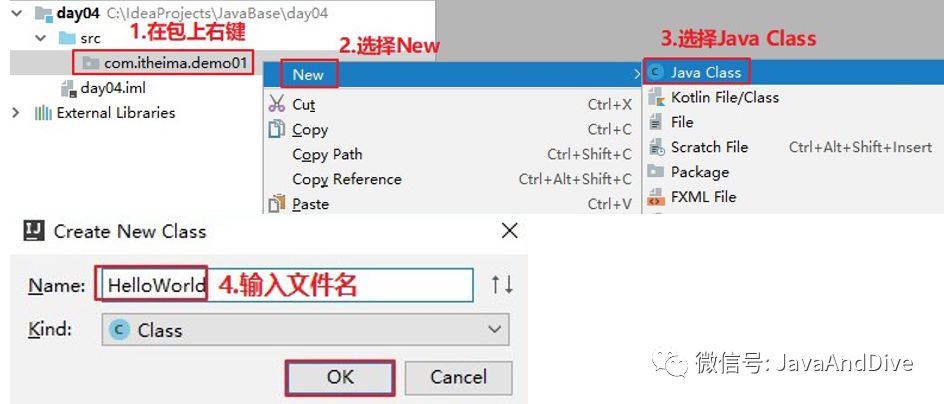 4. 在创建好的包上,鼠标右键,选择 new->class 创建类,键入类名。