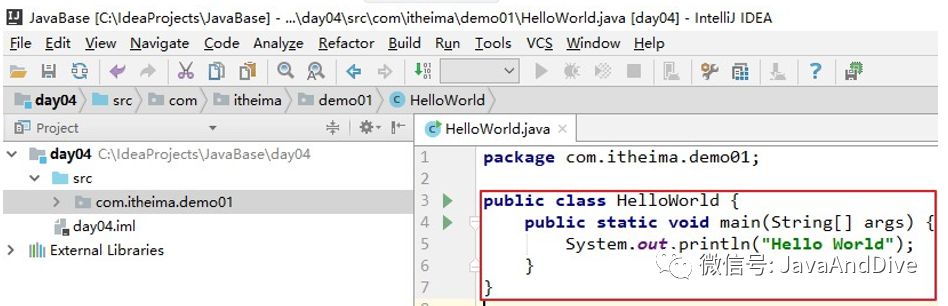 5. 在代码编辑区,键入主方法,并输出 HelloWorld 。