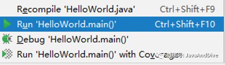 6. 运行程序,在代码编辑区鼠标右键,选择 Run HelloWorld 即可,或在菜单中选择Run->Run HelloWorld 。