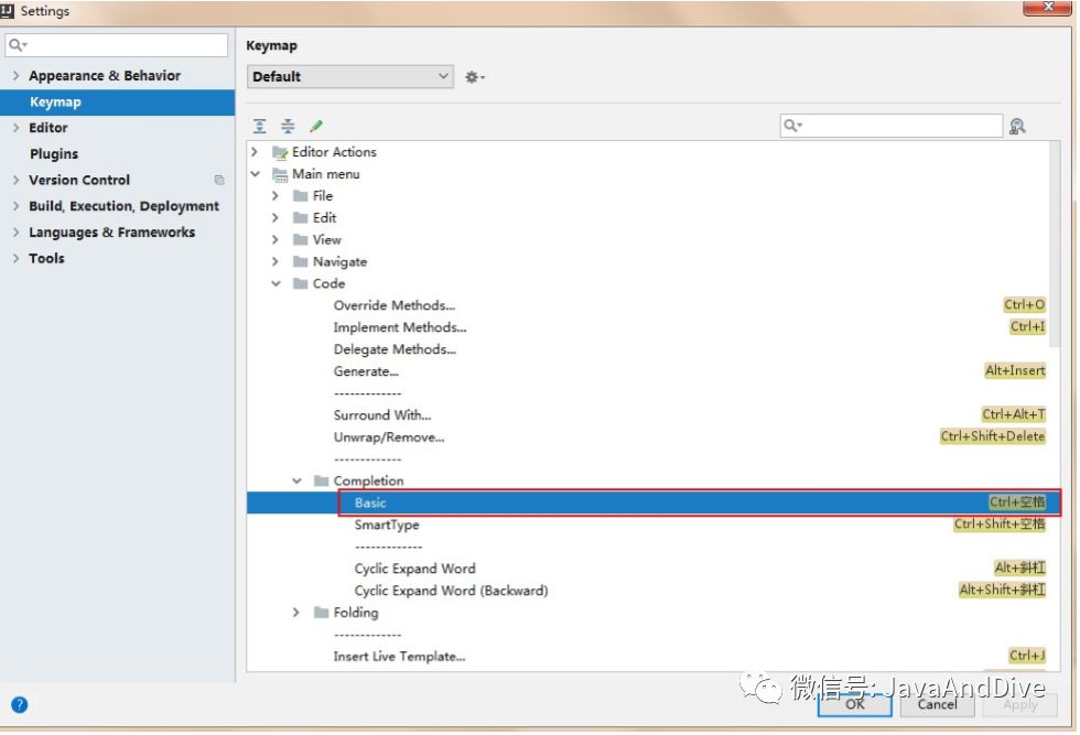 在IDEA工具中,类似于 Ctrl+空格的快捷键,可以帮助我们补全代码,但是这个快捷键可能和和 Windows中的输入法切换快捷键冲突,需要修改IDEA中的快捷键为自己喜欢的快捷键组合。详细步骤如下: File->Settings->keymap->Mainmenu->code->Completion->Basic