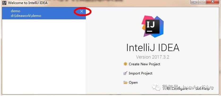 2. File->Close Project 这时IDEA回到了刚启动界面,点击项目上的 X ,IDEA中就没有这个项目了