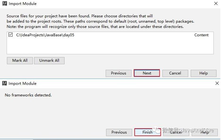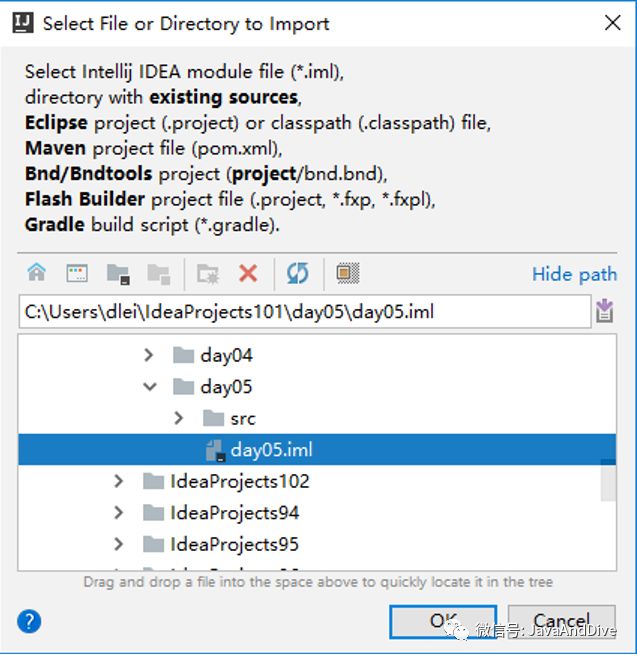 3. 选择要导入模块的路径(注意:需要选中day05下的day05.iml导入到工程中去,否则可能出现问题)