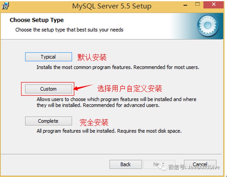2、选择安装类型,有“Typical(默认)”、“Complete(完全)”、“Custom(用户自定义)”三个选项,选择“Custom”,按“next”键继续。