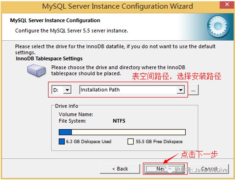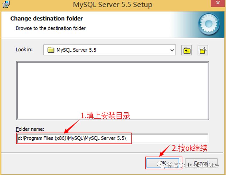 4、填上安装目录,我的是“D:\Server\MySQL\MySQL Server 5.5”,也建议不要放在与操作系统同一分区,这样可以防止系统备份还原的时候,数据被清空。按“OK”继续。