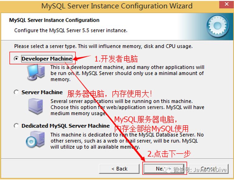3、选择服务器类型,“Developer Machine(开发测试类,mysql占用很少资源)”、“Server Machine(服务器类型,mysql占用较多资源)”、“Dedicated MySQL Server Machine(专门的数据库服务器,mysql占用所有可用资源)”