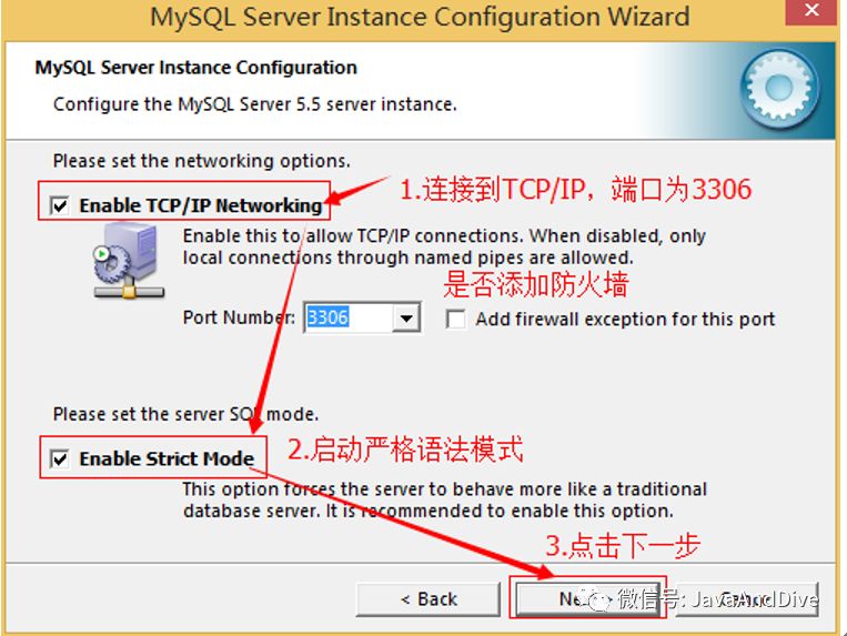 6、是否启用TCP/IP连接,设定端口,如果不启用,就只能在自己的机器上访问mysql数据库了,在这个页面上,您还可以选择“启用标准模式”(Enable Strict Mode),这样MySQL就不会允许细小的语法错误。如果是新手,建议您取消标准模式以减少麻烦。但熟悉MySQL以后,尽量使用标准模式,因为它可以降低有害数据进入数据库的可能性。按“Next”继续