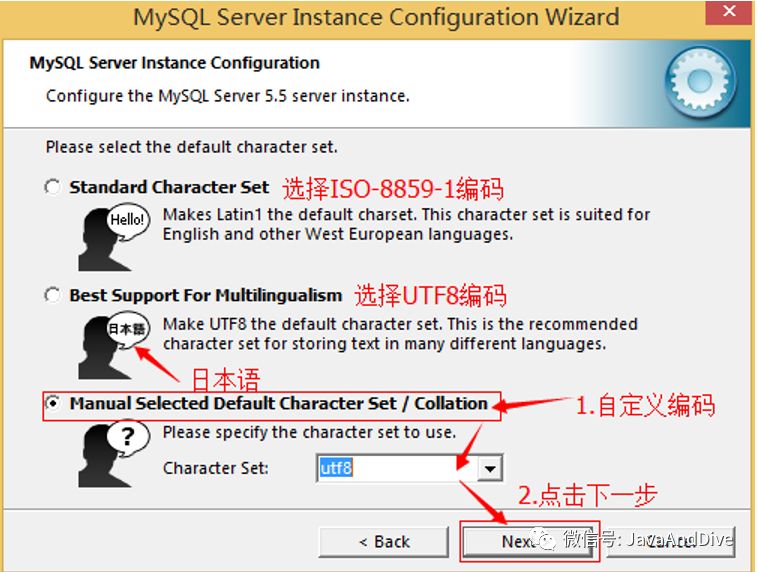 7、就是对mysql默认数据库语言编码进行设置(重要),一般选UTF-8,按 “Next”继续。